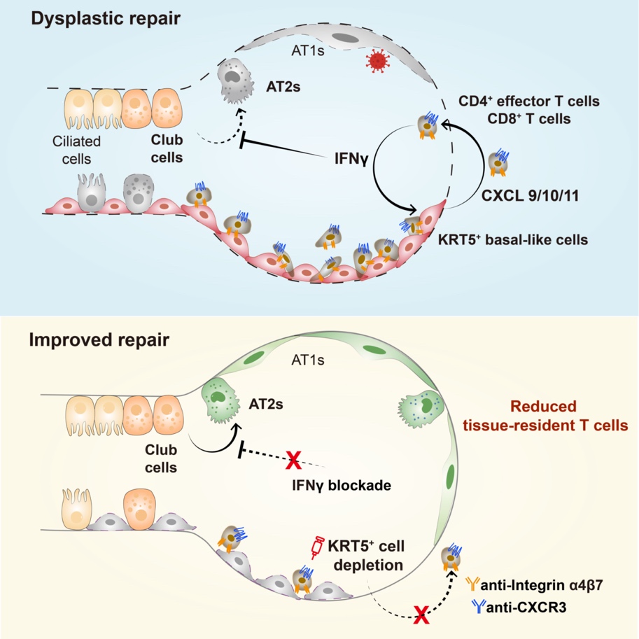 12月23日,上海科技大学生命科学与技术学院席莹教授、上海市第六人民医院任涛教授和广州医科大学/广州实验室赵金存教授团队合作在国际学术期刊《细胞-干细胞》(Cell Stem Cell)上在线发表了题为“Dysplastic epithelial repair promotes the tissue-residence of lymphocytes to inhibit alveolar regeneration post viral infection”的研究论文,首次揭示了肺组织中异常修复的KRT5+基底样细胞对T细胞组织驻留的促进作用,同时发现流感病毒清除后持续存在的T细胞会抑制气道Club细胞介导的肺泡修复。