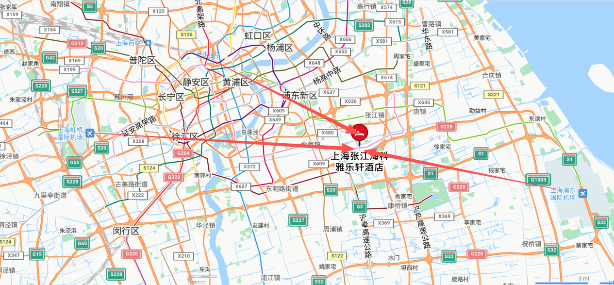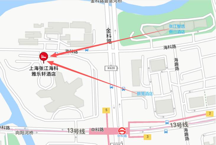 张江智选假日酒店(Holiday Inn Express)至会议酒店,全程约850米,步行10分钟。