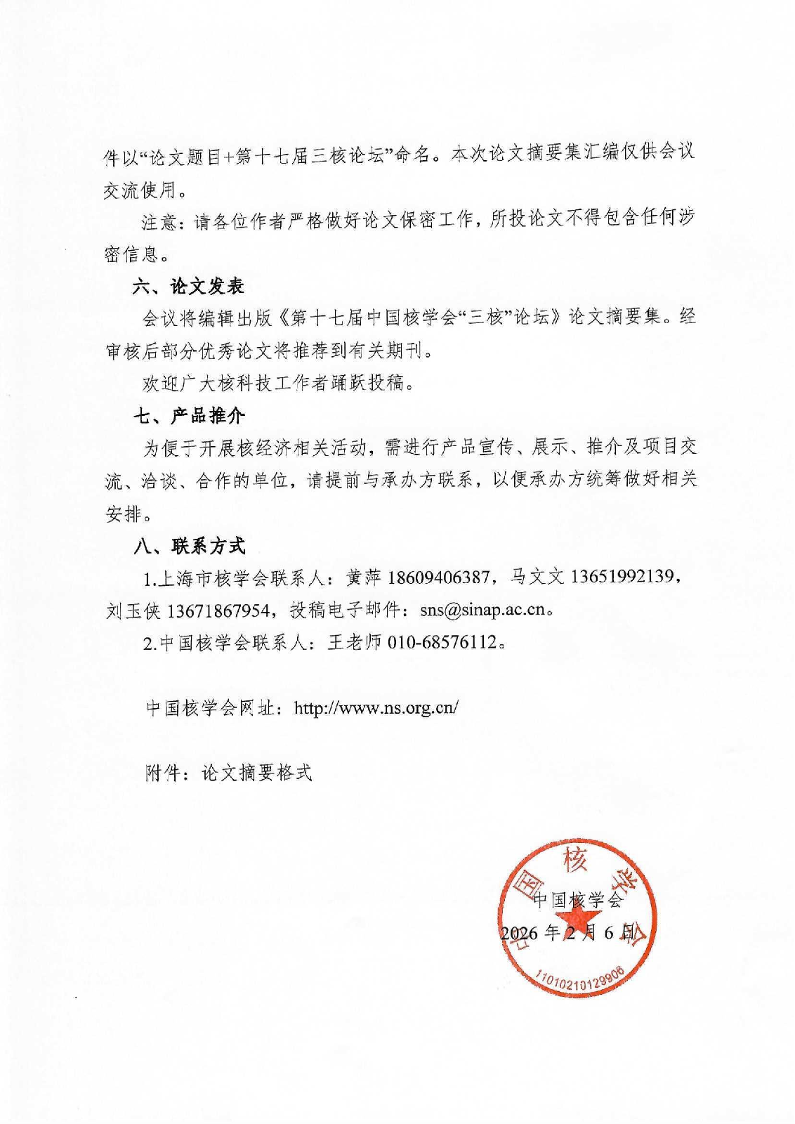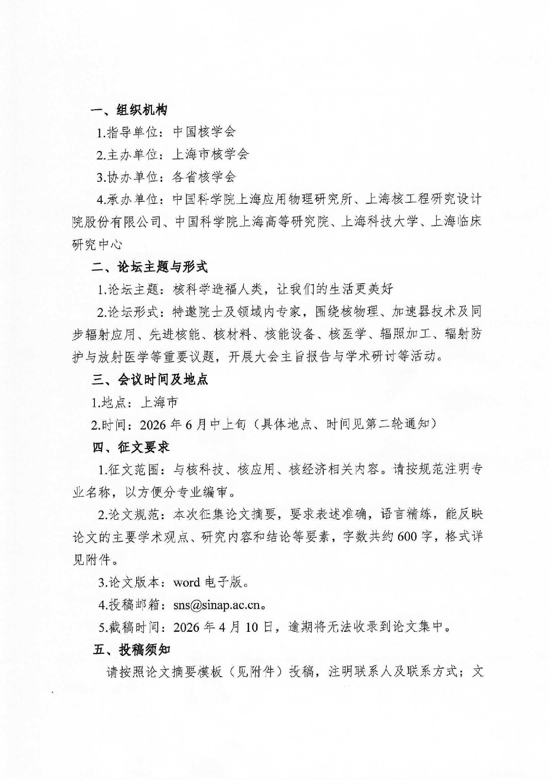 3.论坛征文:本次论坛将编辑出版《第十七届中国核学会“三核”论坛》论文摘要集。征文范围涵盖与核科技、核应用、核经济相关内容。论文摘要要求表述准确,语言精练,能反映论文的主要学术观点、研究内容和结论等要素,字数共约600字,请2026年4月10日前将word电子版发至投稿邮箱sns@sinap.ac.cn(具体详见附件1)。