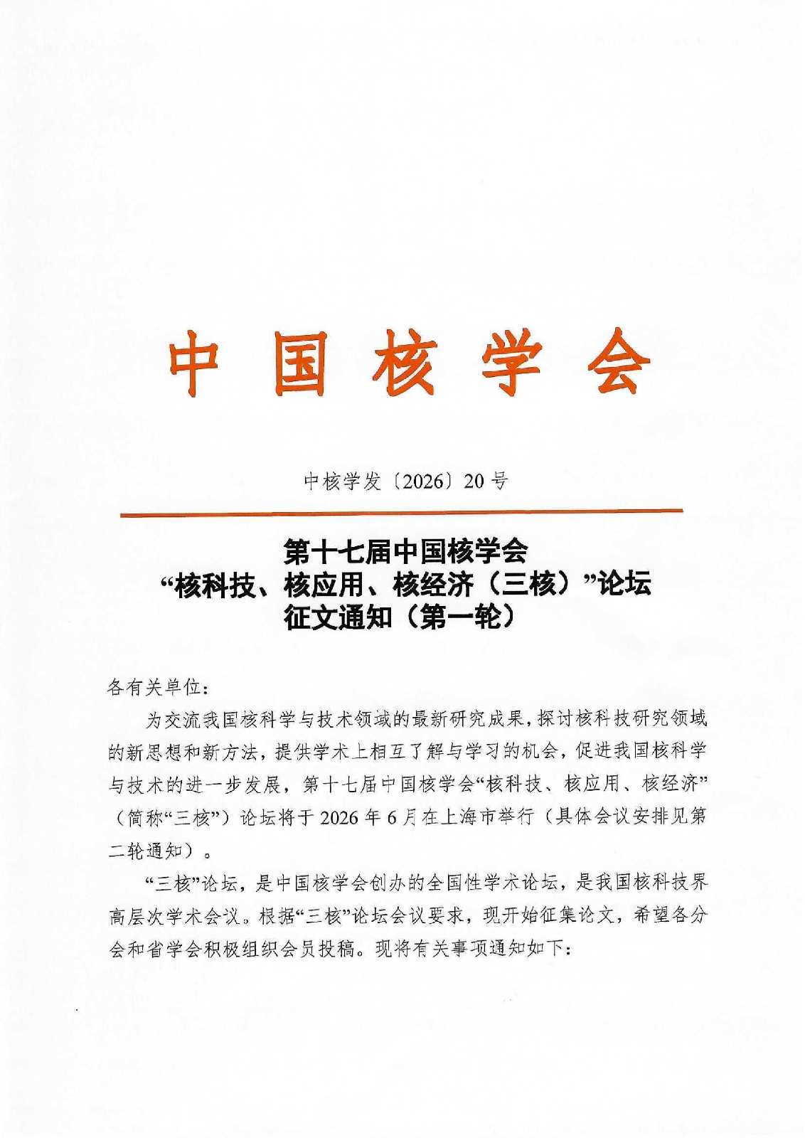 附件1:第十七届中国核学会“核科技、核应用、核经济(三核))”论坛征文通知(第一轮)