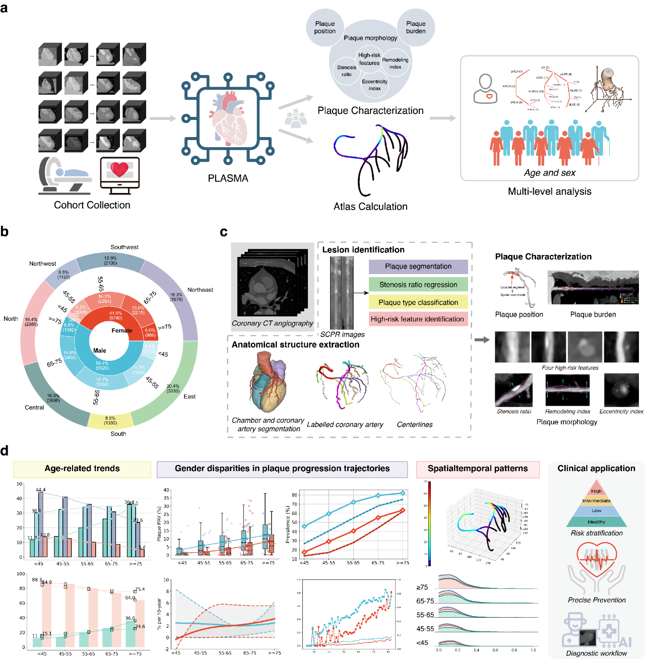 该论文基于中国多中心回顾性连续队列,纳入 16300 例接受 CCTA 检查的患者,结合联影智能 CTA 斑块智能分析系统,首次构建冠脉斑块空间图谱,解析冠脉粥样硬化年龄、性别特征,并对比中西方人群差异,为本土诊疗指南优化提供关键循证依据。