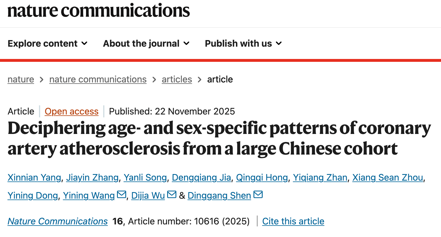 11月22日,上海临床研究中心特聘科学家、上海科技大学生物医学工程学院沈定刚团队与联影智能、香港城市大学、上海交通大学医学院附属第一人民医院、北京协和医院等单位联合完成的中国人群冠脉疾病大规模研究,其科研论文成果《Deciphering Age- and Sex-Specific Patterns of Coronary Artery Atherosclerosis from a Large Chinese Cohort》,发表于国际权威期刊《Nature Communications》(影响因子:15.7)。