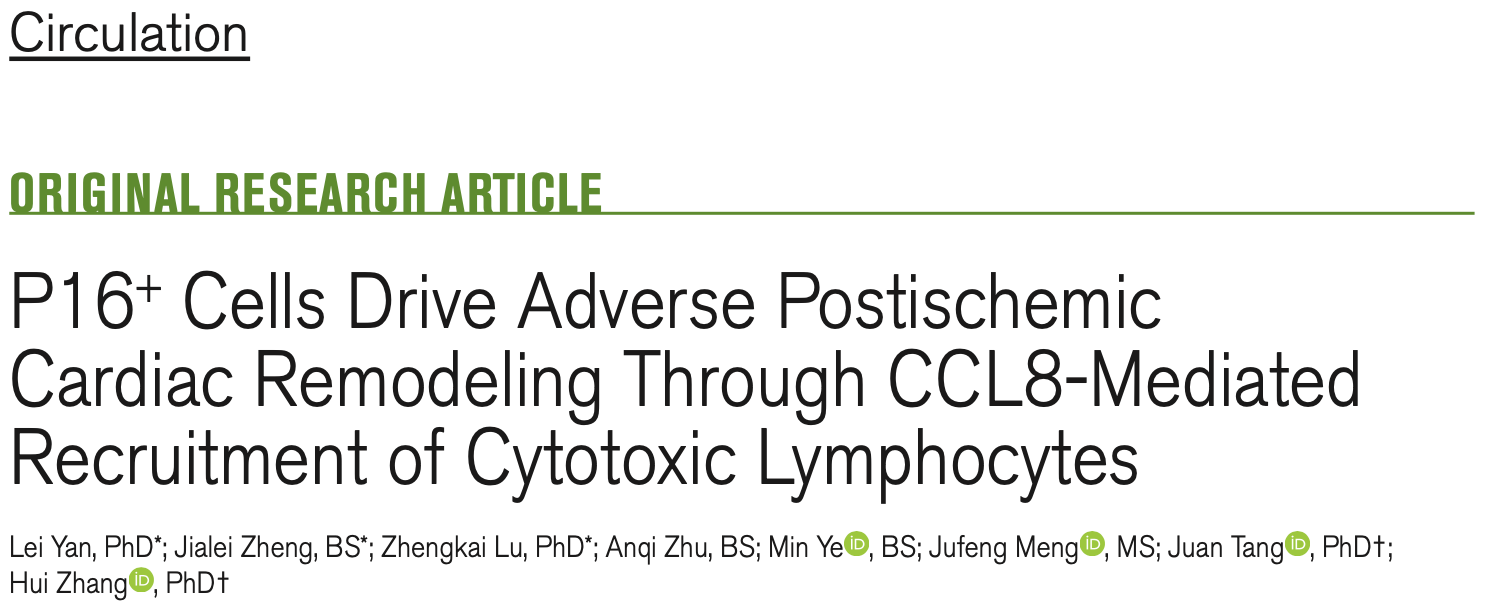 心肌梗死后,心脏会经历由炎症、细胞死亡和纤维化瘢痕形成等驱动的不良重塑,最终导致心力衰竭。然而,驱动过程中的细胞和分子机制一直未被完全阐明。近日,上海临床研究中心特聘科学家、上海科技大学生命科学与技术学院张辉教授团队与同济大学唐娟教授团队联合在《循环》(Circulation)发表一项突破性研究,首次系统揭示了P16阳性细胞在心脏不良重塑中的关键作用,并提出了靶向CCL8信号或P16阳性成纤维细胞的精准干预新策略,为开发基于免疫调节和细胞精准治疗的新型心梗药物提供了重要的理论基础。
