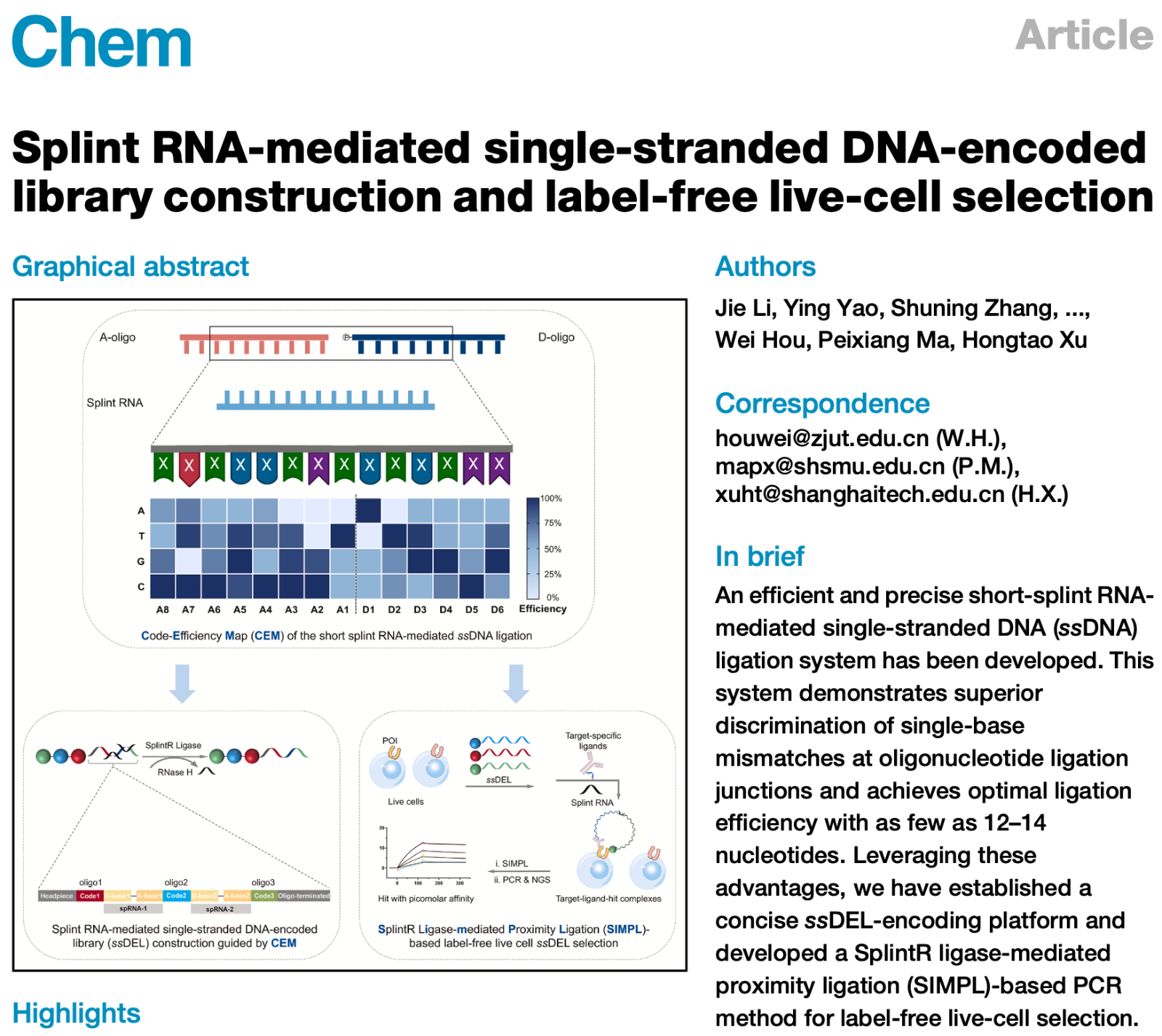 近日,上海科技大学免疫化学研究所许红涛/上海交通大学医学院附属第九人民医院马培翔/浙江工业大学侯卫合作在Cell姊妹期刊Chem上发表了题为“Splint RNA-mediated single-stranded DNA-encoded library construction and label-free live-cell selection ”的研究,报道了一种夹板RNA介导单链DNA编码化合物库(ssDEL)编码方法和活细胞无标记筛选系统。