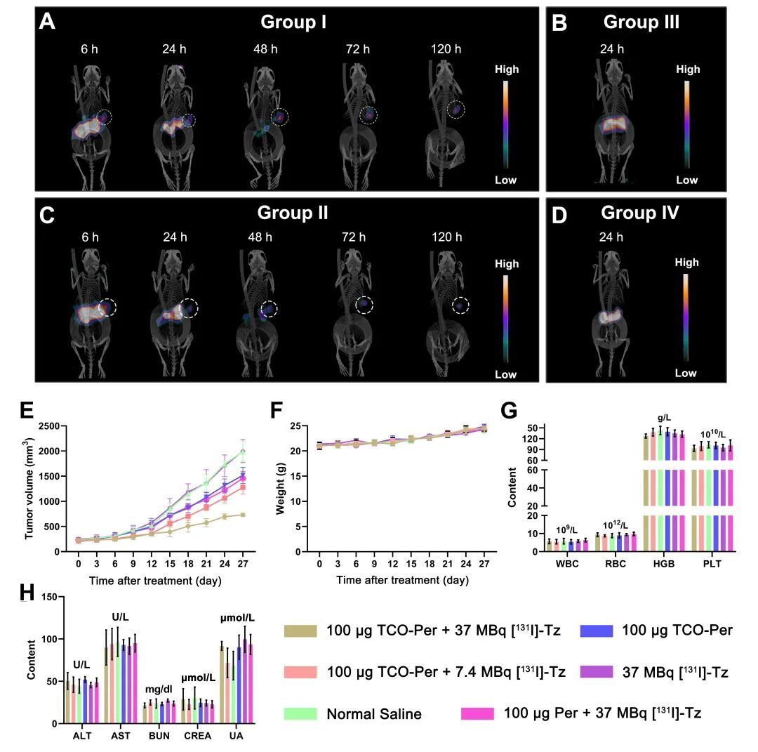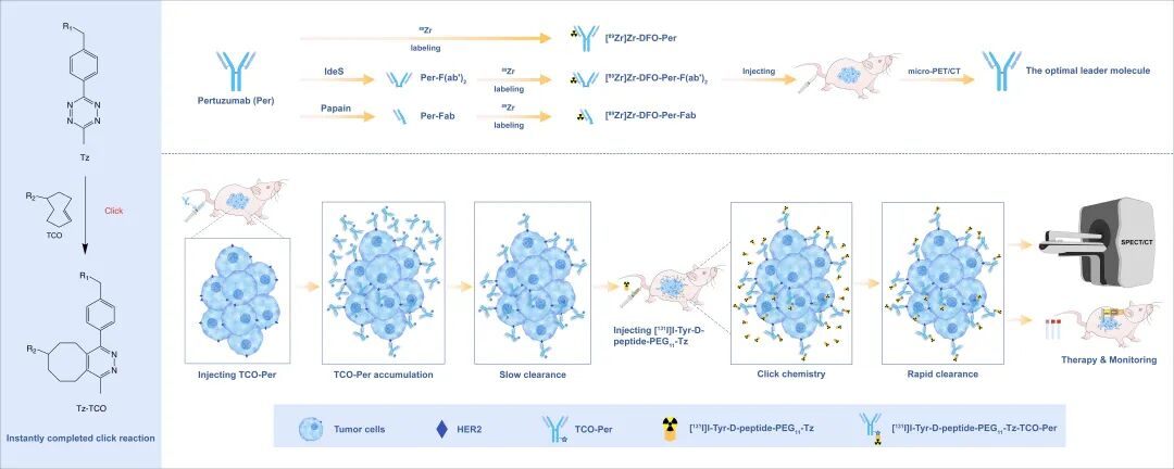 总体而言,该研究成功构建并验证了一种新型的靶向HER2的预定位诊疗一体化体系,其显示出良好的成像与治疗应用前景。该工作不仅为生物正交点击化学在核医学中的应用提供了新的实验依据,也为预定位诊疗策略的进一步优化和临床转化奠定了基础。