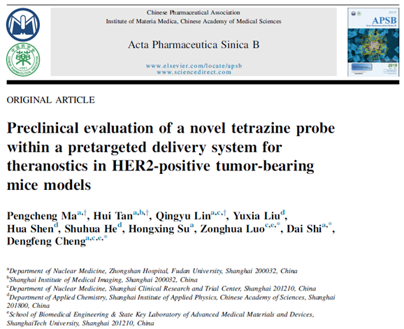 近日,上海临床研究中心/上海科技大学生物医学工程学院程登峰教授联合罗宗化教授团队,在药学领域国际权威期刊《Acta Pharmaceutica Sinica B》(影响因子14.6)发表题为“Preclinical evaluation of a novel tetrazine probe within a pretargeted delivery system for theranostics in HER2-positive tumor-bearing mice models”的研究论文。该研究围绕HER2阳性肿瘤的精准诊疗需求,构建了一种基于生物正交点击化学的预定位放射性核素递送系统,为HER2阳性实体瘤的高对比度显像和安全有效治疗提供了新的策略。