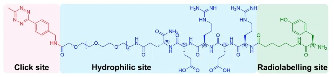 从结构上看该探针主要由三部分组成(图2):一部分为负责与TCO修饰抗体发生点击反应的四嗪基团;一部分为用于改善亲水性和体内行为的PEG11及D型多肽序列;另一部分则为用于放射性核素标记的酪氨酸位点。这样的结构设计,使该探针不仅能够实现高效点击,还兼顾了体内稳定性、可标记性和药代动力学特征,为预定位体系的实际应用提供了重要支撑。